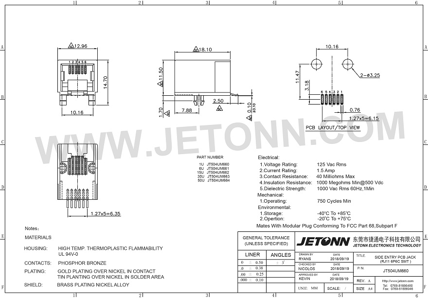 東莞市捷通電子科技有限公司主營RJ11 6P6C插座等其他它精密連接器,我司擁有專業的生產設備和技術型人才,我們堅持匠心品質,持續改進,為客戶提供滿意的產品,歡迎廣大客戶前來咨詢:0769-81886480